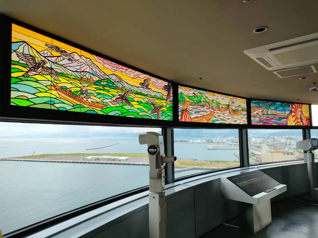 三角形の建物が特徴的ですが、アスパムはまず「展望台」が魅力で、上に上がると青森の地形と港町の様子が一望できます。