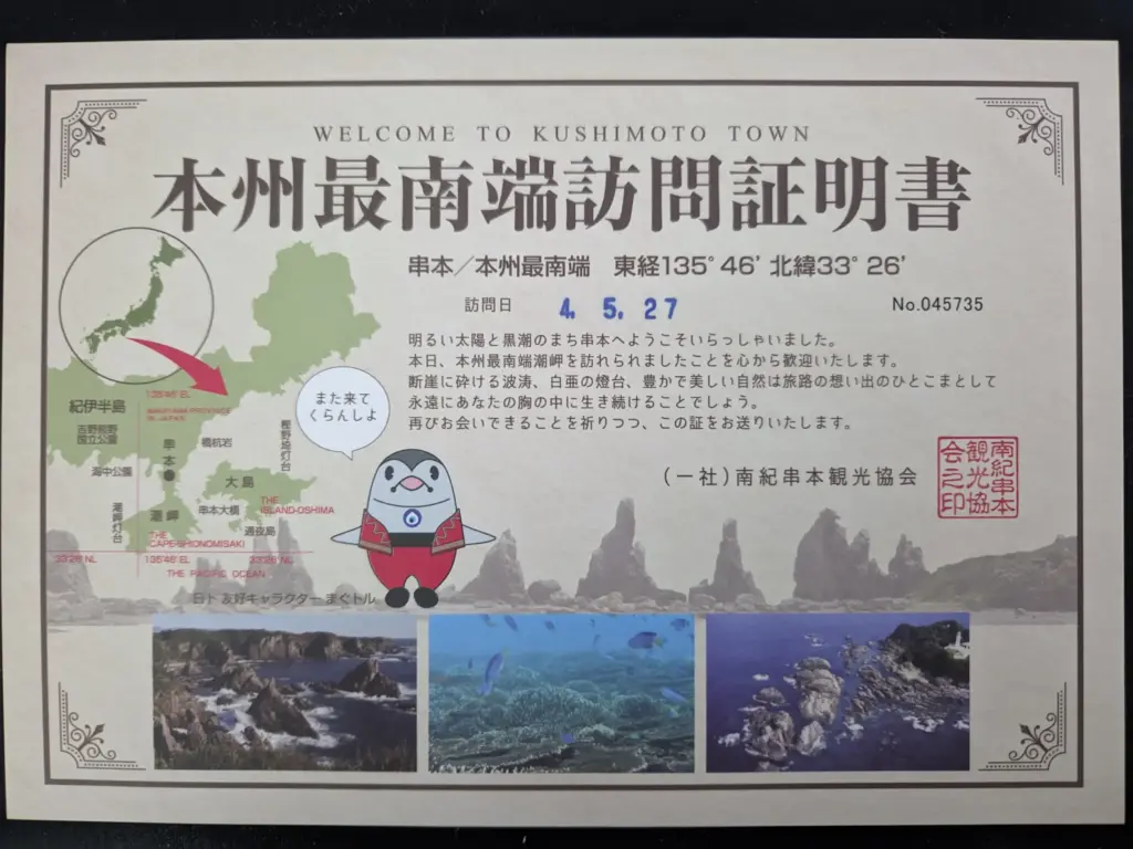 その車なし旅行の途中で宿泊した和歌山県串本町の宿で、本州最南端到達証明書の存在を知り、日本の4端に到達してみたいと思うようになり、現在挑戦しています。